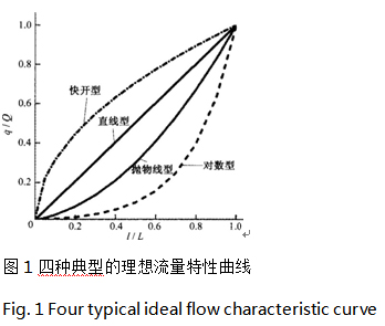 在常見的調(diào)節(jié)閥中,有四種典型的流量特性曲線,即直線型、對(duì)數(shù)型(也稱等百分比型)、快開型、拋物線型」,分別對(duì)應(yīng)圖1中的曲線1、2、3、4。直線型流量特性的調(diào)節(jié)閥,流量隨行程線性變化,在小開度時(shí)流量變化明顯(流量變化量與流量的比值大),調(diào)節(jié)靈敏度高,而在大開度時(shí),流量變化相對(duì)緩慢(流量變化量與流量的比值?。?,調(diào)節(jié)靈敏度低,因而出現(xiàn)大開度下調(diào)節(jié)能力不足等問題,因此在一些情況下不能滿足調(diào)節(jié)要求。對(duì)數(shù)型流量特性的調(diào)節(jié)閥,流量變化速度逐漸加快,小開度時(shí)流量變化緩慢,調(diào)節(jié)精度高,大開度時(shí)流量變化相對(duì)較快,能保持良好的調(diào)節(jié)能力,這些特點(diǎn)使其在工程中得到了廣泛的應(yīng)用。拋物線型調(diào)節(jié)閥的調(diào)節(jié)特性介于直線型和對(duì)數(shù)型兩者之間田,這種特性的調(diào)節(jié)閥在工程應(yīng)用中也比較常見??扉_型調(diào)節(jié)閥的調(diào)節(jié)特點(diǎn)與對(duì)數(shù)型相反,小開度時(shí)流量迅速變化,達(dá)到快速加大流量的目的,而大開度時(shí)流量變化緩慢。除了這四種典型曲線外,還有雙曲線型、平方根型等流量特性曲線,但并不常見。