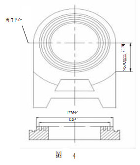 為電動閘閥導軌和閥板的配合示意圖,導軌均為楔形結(jié)構(gòu),導軌與座圈組裝后,形成一帶角度的空隙,閥板導軌在此空隙間移動。要求閥關(guān)閉后其閥板與閥座圈密封面的間隙平均小于 0.051mm。此閥為常開閥,正常情況下,每年關(guān)閉不超過 1 次,關(guān)閉時,一方面靠流通介質(zhì)的力量使閥板與座圈貼緊,另一方面,通過閥板楔入,使閥板與座圈的密封面貼緊,從而達到密封的目的。 該閥門的開關(guān)行程為 1300mm,理論上座圈導軌的工作長度是 1300mm(從閥門中心起),實際上座圈導軌除閥門通道口受流通介質(zhì)沖蝕外,其余部分只起導向作用,所以我們可以在滿足工況要求的前提下將座圈導軌的堆焊部位縮短,使其長度大于環(huán)形密封面口徑的一半 670mm (從閥門中心起)即可。 考慮以上原因,我們調(diào)整加工工藝為:粗車平面及環(huán)形堆焊槽,粗車導軌堆焊部位(粗車圖如圖 4),劃導軌堆焊位置線,堆焊,熱,校平,精車環(huán)形密封面,精刨導軌,在粗加工階段為盡量增大工件的剛性,同時減少工序周轉(zhuǎn),座圈尾部先不加工,精加工完環(huán)形密封圈及導軌后,在導軌與環(huán)形密封面夾縫處仍有大量毛坯高出密封面及導軌,須將其去除,我 們采用銑加工。