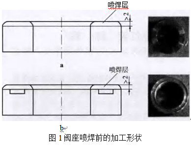 為了避免等離子弧高加熱速度和溫度產(chǎn)生的涂層剝落破壞的開裂、飛濺、滴流及其他不良影響,在任何加工形式時應仔細選擇噴涂規(guī)范。等離子弧噴焊時的工藝參數(shù)如表1所示。等離子噴涂噴槍的功率40 kw,送粉方式為槍外送粉。另外,噴嘴到工件距離為1儺巧mm,工作臺轉(zhuǎn)速10、巧r/min等離子弧噴焊時和噴焊后的閥座外觀如圖2所示。