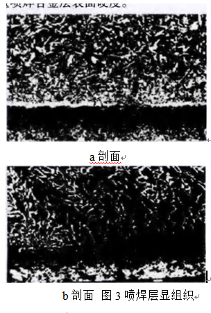 由圖3a可知,結(jié)合層由兩部分組成,即上方的噴焊合金層和下方的母材熱影響區(qū)層。合金層組織主要呈枝晶生長狀態(tài),且枝晶細??;從圖3b可看出