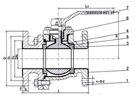 1、閥體2、閥體襯里3、閥座4、球體5、球體襯里6、填料函7、手柄